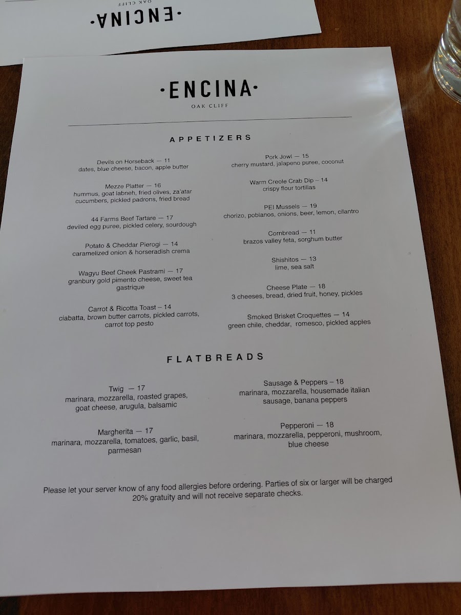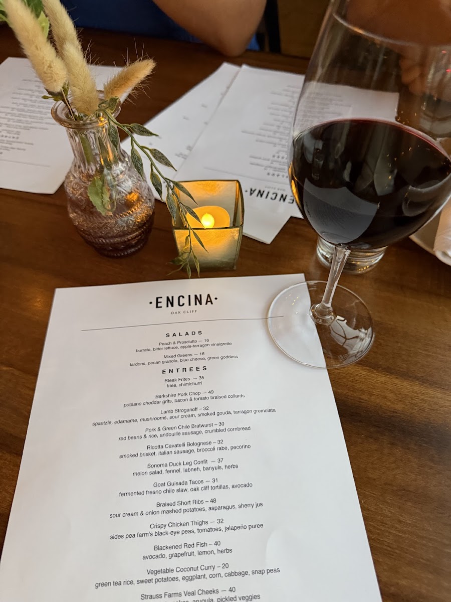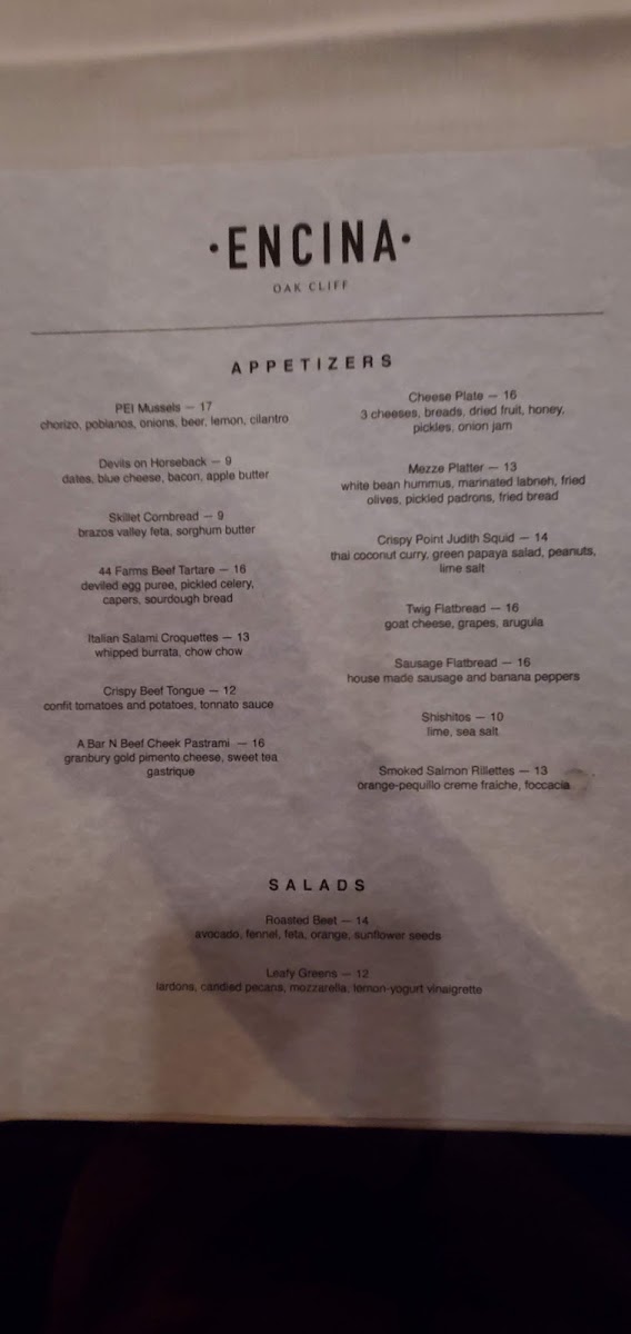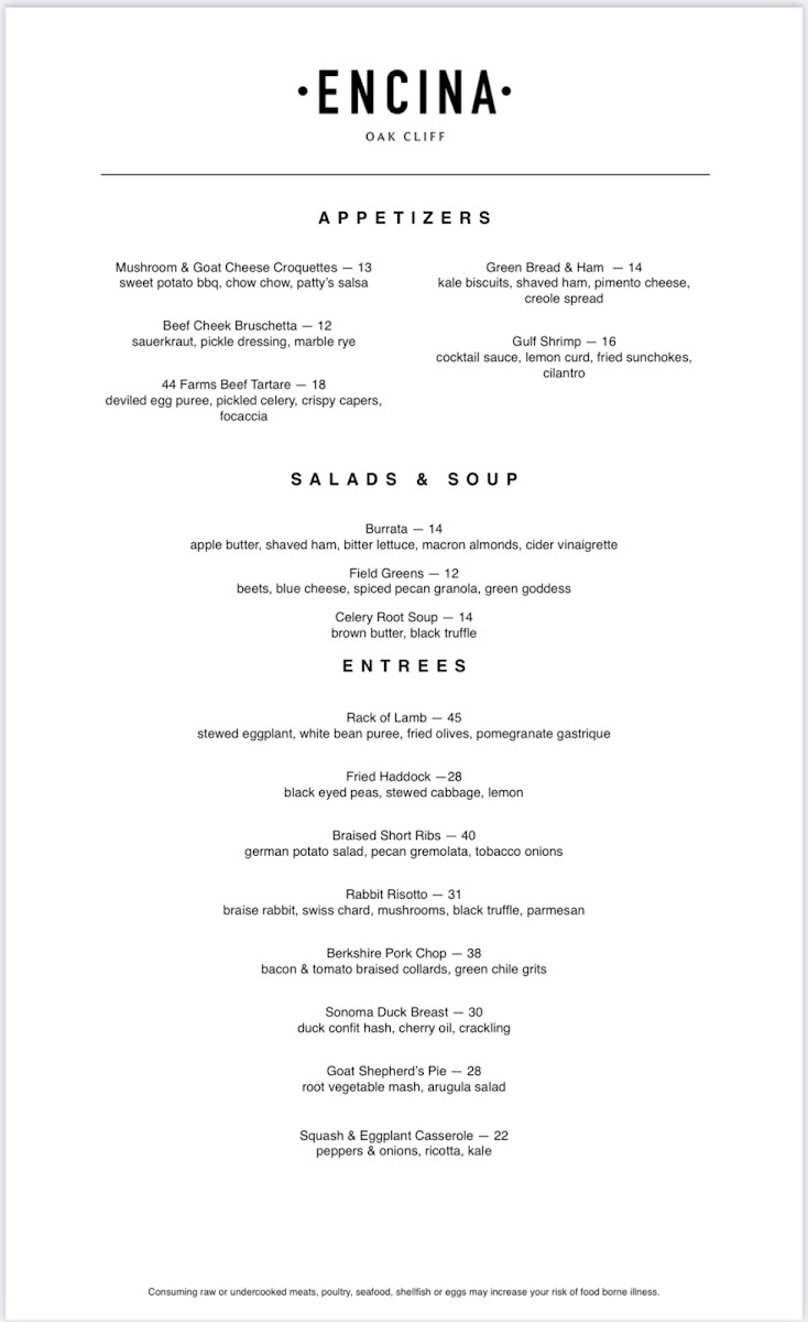 From a reviewer’s perspective, the menu at Encina, located at 614 W Davis St, Dallas, TX 75208, presents a thoughtful and well-curated reflection of modern American dining with a strong seasonal and regional influence. The dinner appetizers set the tone with refined yet comforting choices such as A Bar N Beef Cheek Pastrami, Devils on Horseback, 44 Farms Steak Tartare, Cheese Plate, and Skillet Cornbread, all of which highlight quality sourcing and balanced flavors. Salads like Comeback Creek Tomato and Roasted Beet provide lighter, fresh contrasts before moving into satisfying entrées including Berkshire Pork Chop, 44 Farms NY Strip, Beer Battered Catfish, Roasted Rainbow Trout, and Windy Meadows Chicken Thighs, showcasing a range from hearty meats to delicately prepared seafood. Desserts such as PSL Panna Cotta and Bread Pudding offer a comforting and elegant close to the meal.