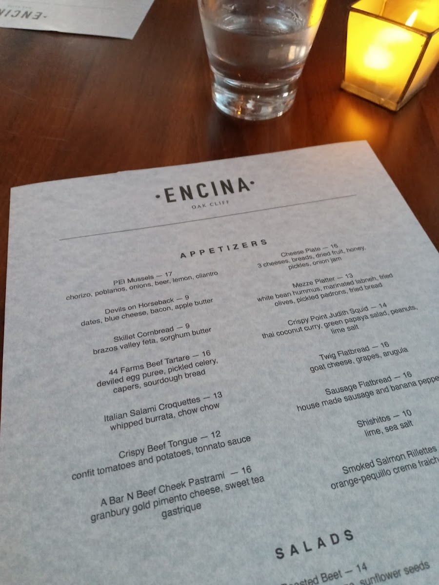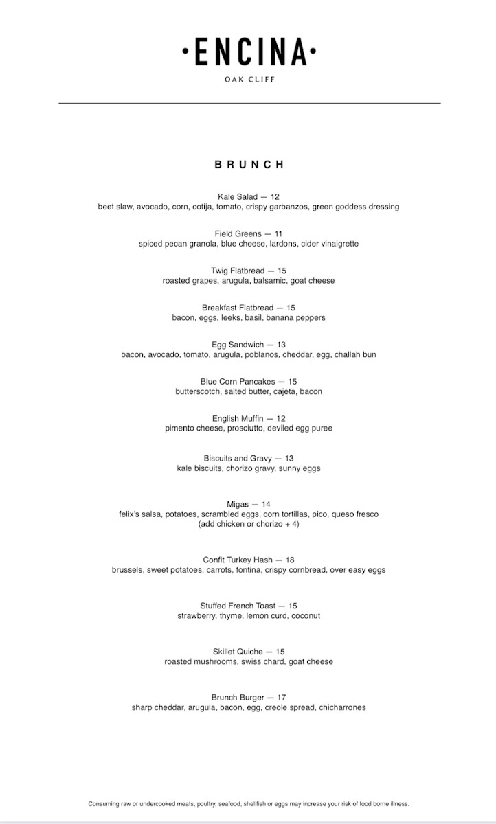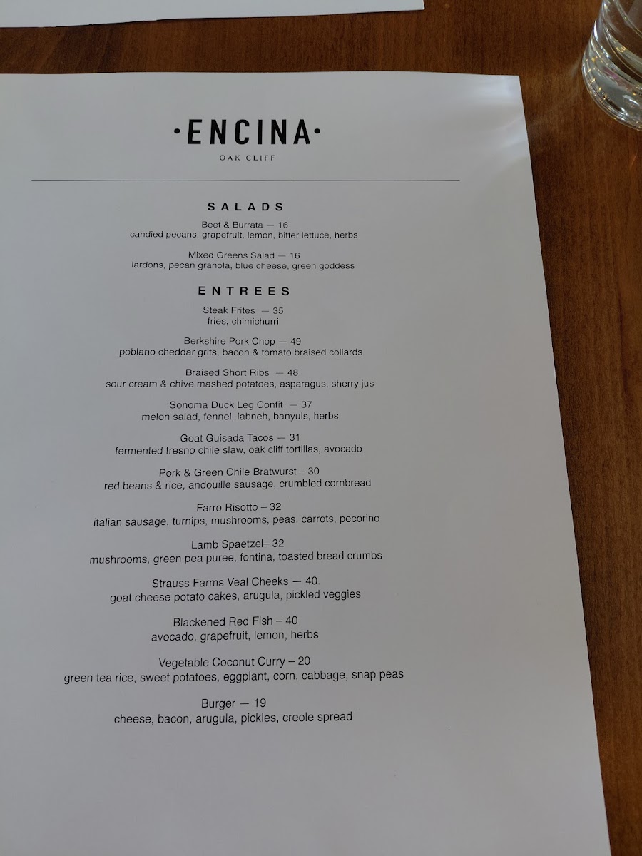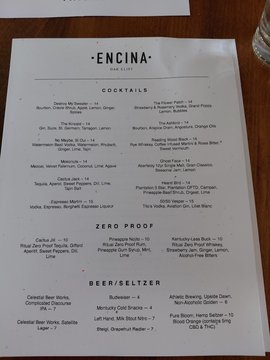 From a reviewer’s perspective, the menu at Encina, located at 614 W Davis St, Dallas, TX 75208, presents a thoughtful and well-curated reflection of modern American dining with a strong seasonal and regional influence. The dinner appetizers set the tone with refined yet comforting choices such as A Bar N Beef Cheek Pastrami, Devils on Horseback, 44 Farms Steak Tartare, Cheese Plate, and Skillet Cornbread, all of which highlight quality sourcing and balanced flavors. Salads like Comeback Creek Tomato and Roasted Beet provide lighter, fresh contrasts before moving into satisfying entrées including Berkshire Pork Chop, 44 Farms NY Strip, Beer Battered Catfish, Roasted Rainbow Trout, and Windy Meadows Chicken Thighs, showcasing a range from hearty meats to delicately prepared seafood. Desserts such as PSL Panna Cotta and Bread Pudding offer a comforting and elegant close to the meal.